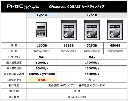 ✅カード寿命の確認とディープリフレッシュができる「Refresh Pro(別売)」対応 ✅製造国:台湾 プログレードデジタル CFexpress Type B COBALTカ ードは信頼性の高いSLC方式を採用し、転送速度は読込最大1700MB/s 書込最大1500MB/sで高速連写はもちろん4K, 6Kなど高精細ビデオ撮影に最適な製品です。