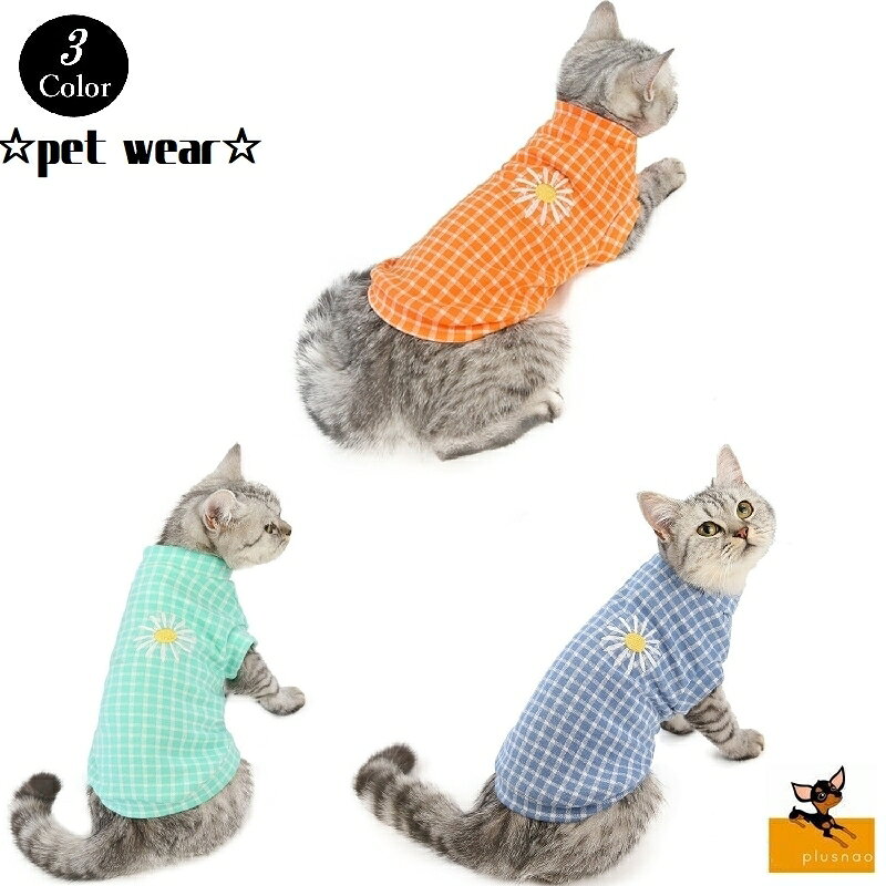 送料無料 ペット服 プルオーバー カットソー キャットウエア ドッグウエア チェック柄 刺繍 花 秋冬 ネコ イヌ お出掛け お散歩 抜け毛対策 寒さ対策 オレンジ グリーン ブルー ペット用品 ねこちゃん わんちゃん 猫 犬