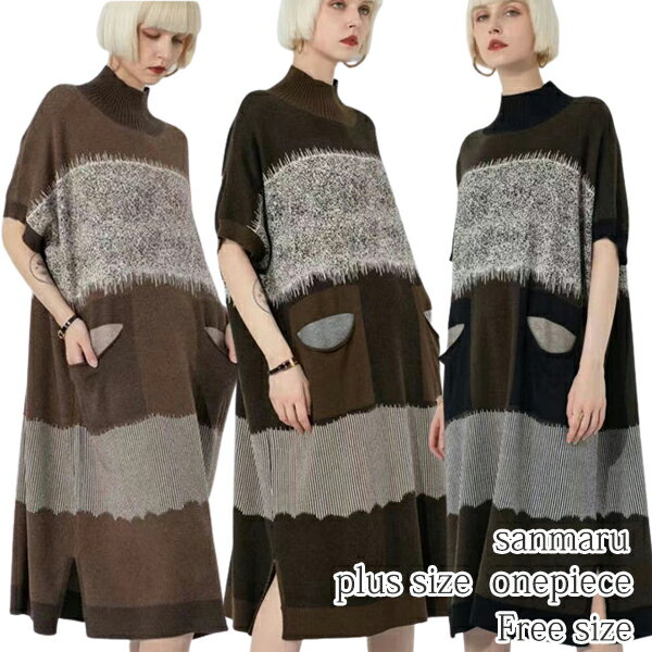 大きいサイズ ワンピース リブ編みハイネック メリヤス編み ジャガード編み ボーダーデザイン エコロジカルカシミア混 ルーズシルエット ドロップショルダー 半袖 サイドスリット ポケット ブラック ダークブラウン グリーンブラウン フリーサイズ 2022秋冬新着【予約】