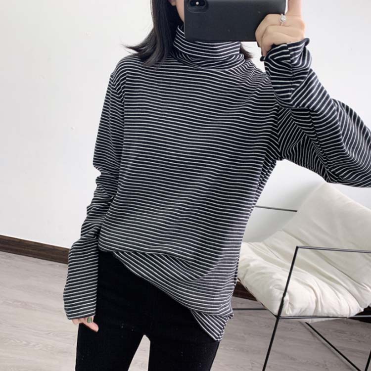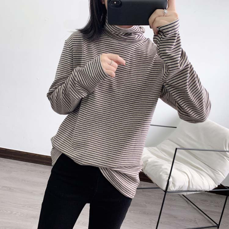 tシャツ ボーダー柄トップス レディース カットソー ハイネックカットソー ハイネックtシャツ ストレッチトップス ボーダー 綿 伸縮性 カジュアル ゆったり 春 レイヤード 送料無料 秋