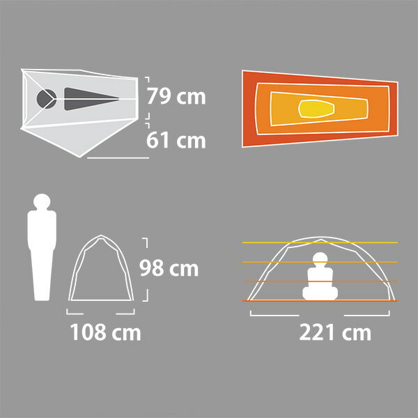 インナーテント上部に特許出願中のフライバー ボリューマイジングポールクリップを設置し、頭上の空間を拡大して軽量コンパクトながら十分な快適性を提供します。