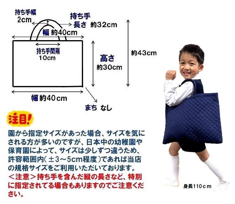▲ ◆日本中の幼稚園や保育園によって、サイズは少しずつ違うため、サイズを気にされる方が多いのですが、許容範囲内でしたら、 当店の規格をご利用いただいております。
