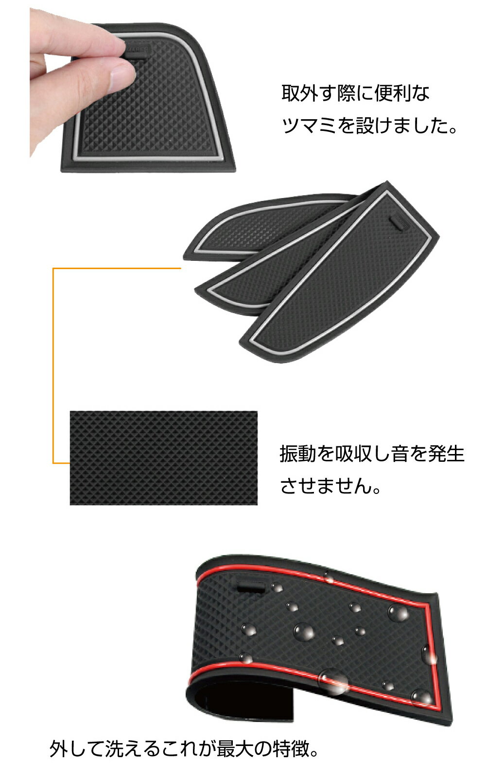 ・車内のコンソールBOX内やドアのポケット等に小物や小銭を入れた際のカタカタ音、動きが気になった事はありません? ・このアイテムは置くだけの簡単設置で騒音・汚れ・傷を防ぎます! ・ラバー素材のマットなのでクッション性、滑り止め効果を持つ等パフォーマンス性に優れています。