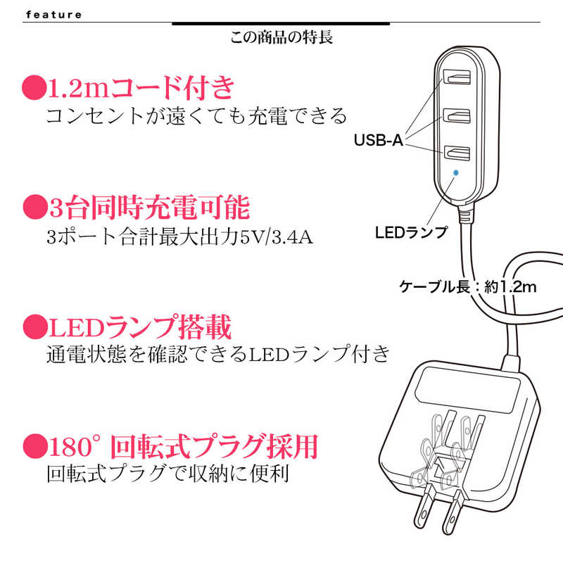 【スペック】●型式:R12AC3A3A01WH(R12AC3A3A01WH)●JANコード:4988075672123仕様1:USB-Aポート×3入力:AC100-240V 50/60Hz出力:1ポート最大 5V/3.4A 3ポート合計 5V/3.4A本体重量:約115gケーブル長:約1.2m梱包内容:AC充電器×1 固定用シール×1この商品は宅配便(佐川急便)でお届けする商品です出荷可能日から最短日時でお届けします。