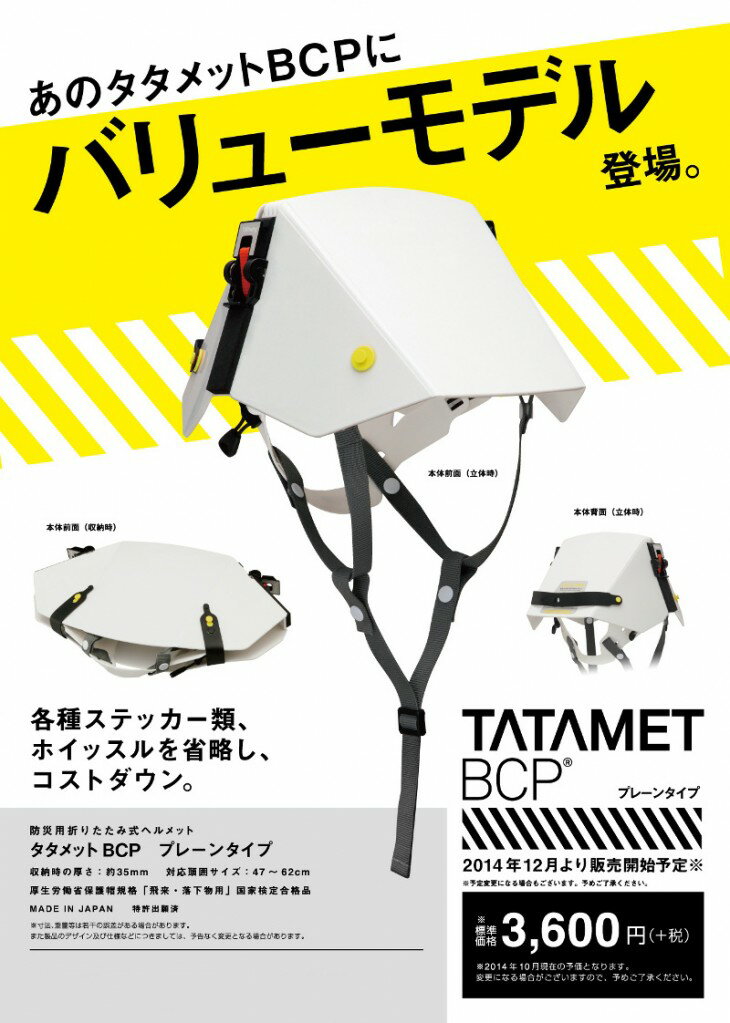 商品説明・仕様あのタタメットBCPにバリューモデル新登場! 収納時の厚さ:約35mm 対応頭囲サイズ:47〜62cm 厚生労働省保護帽規格「飛来・落下物用」国家検定合格品 日本製広告文責(有)テクノウエア TEL 06-4307-6393※パッケージデザイン・仕様は予告なく変更することがあります。